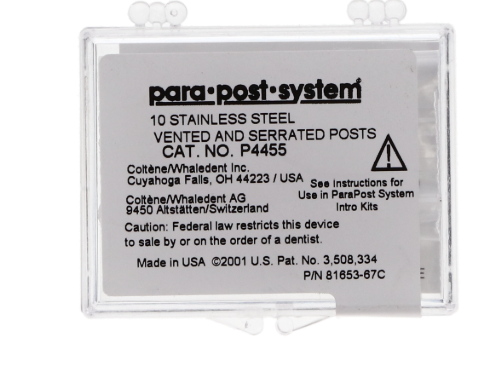 ParaPosts are either stainless-steel or titanium restorative instruments that are specially designed for exceptional direct post and core buildups as well as casting techniques. These cylindrical passive-cemented posts, with a diameter of 0.055 inches, are parallel-sided and feature intersecting ridges to provide maximum core stability for retaining the dental material. Available in a range of sizes and colors for enhanced recognition.