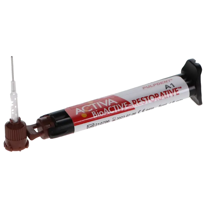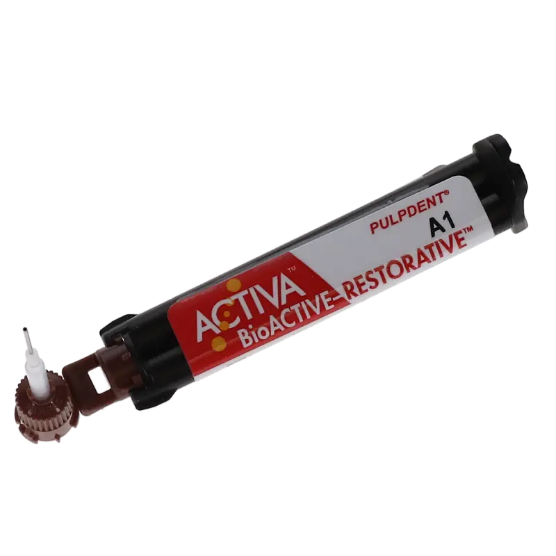 Activa BioActive Restorative releases and recharges fluoride, calcium, and phosphates and contains zero Bisphenol A (BPA), Bis-GMA, and BPA derivatives. Each Value Refill Pack contains 2 (5 ml) syringes and 40 assorted mix tips.