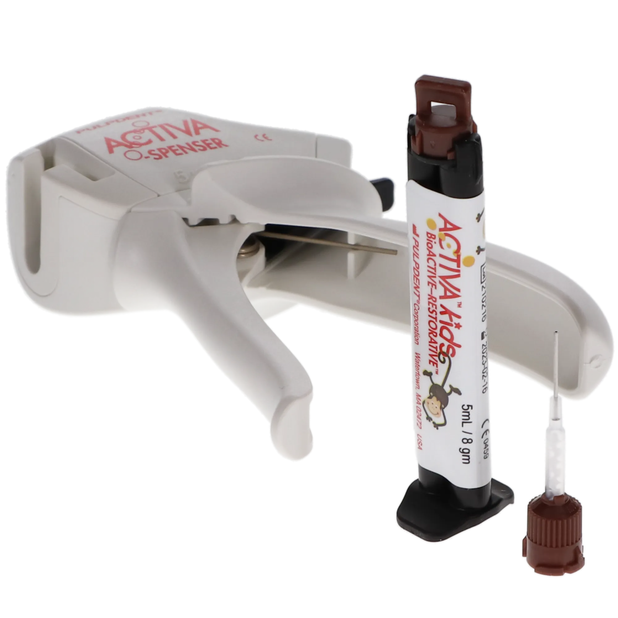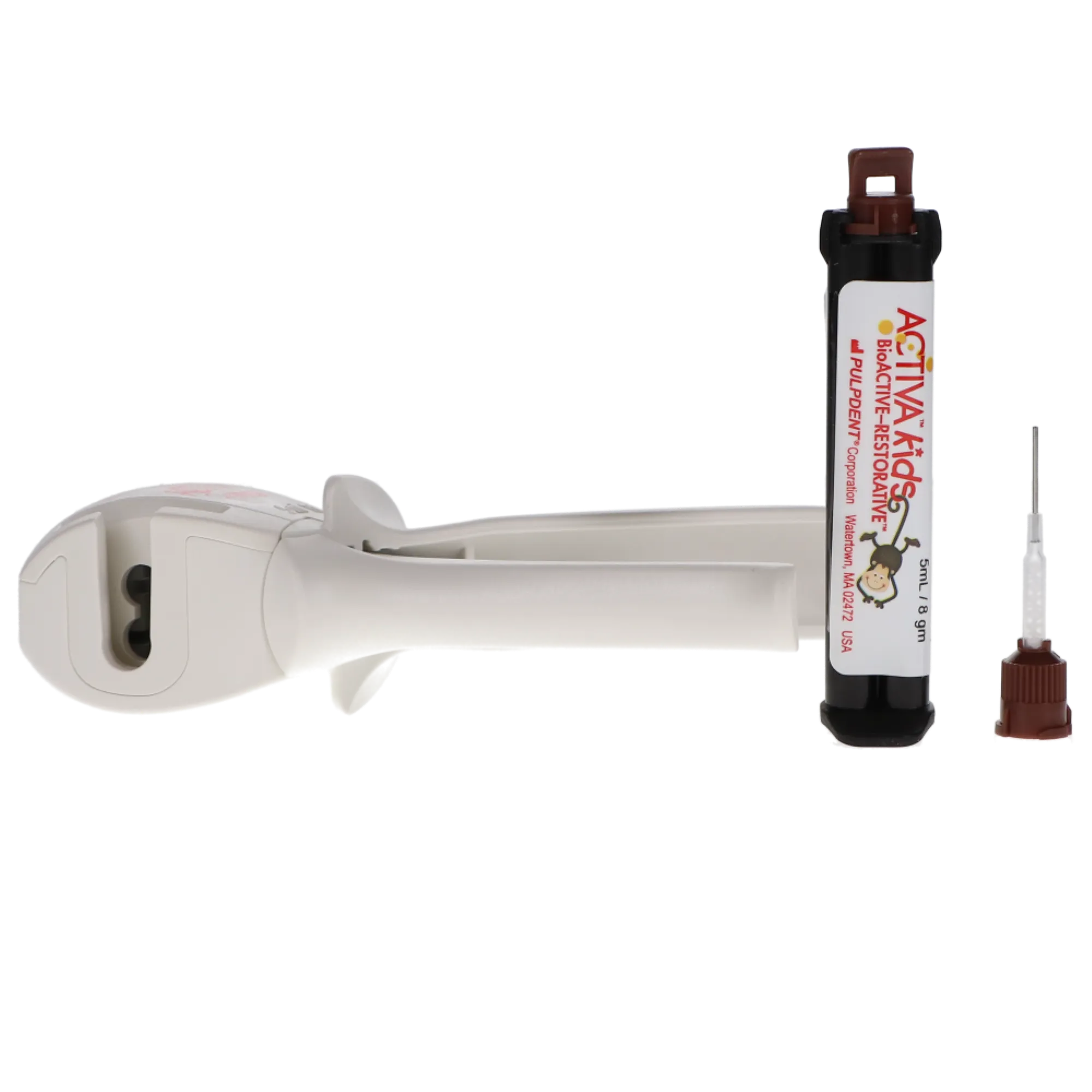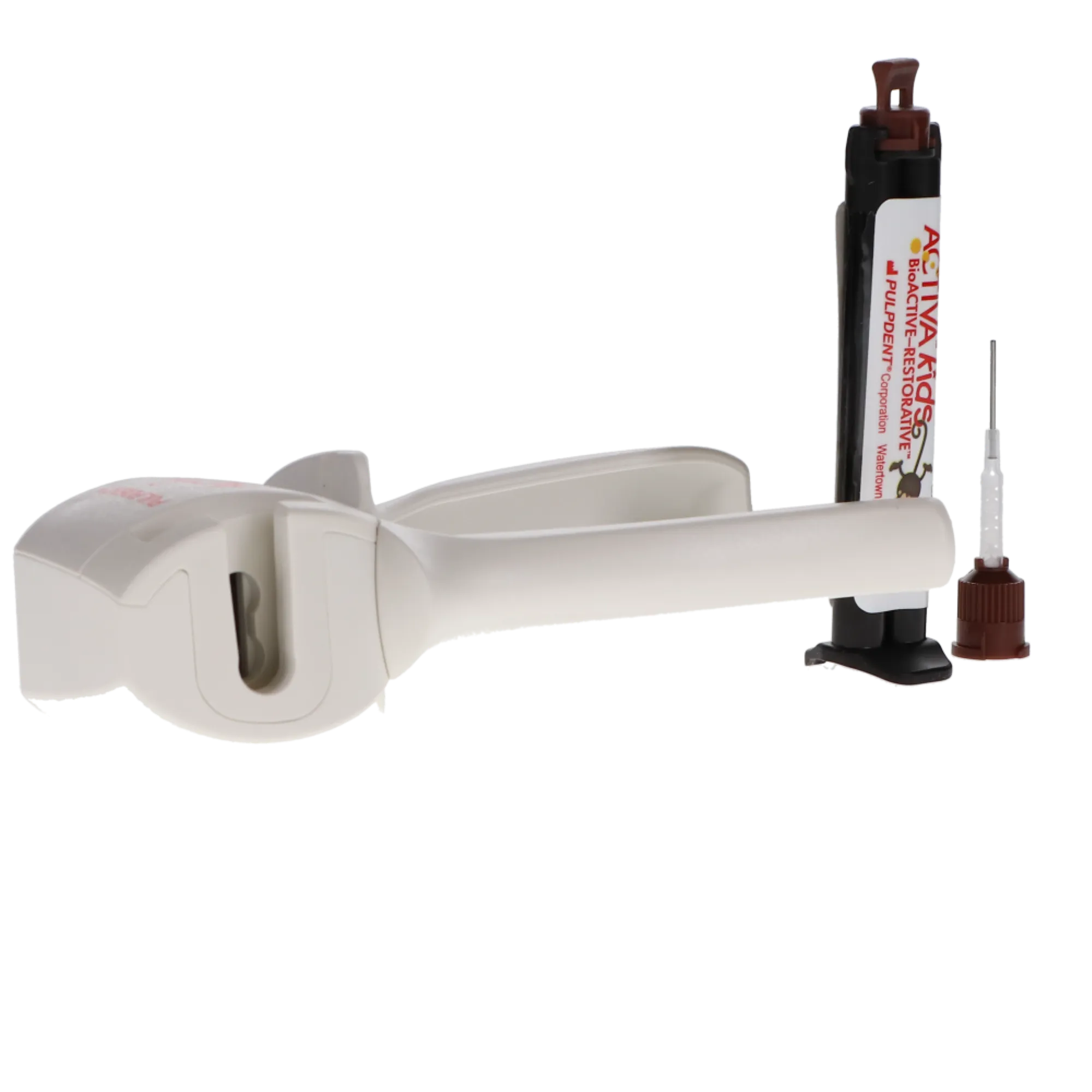 Activa Kids BioActive Restorative releases and recharges fluoride, calcium, and phosphates and contains zero Bisphenol A (BPA), Bis-GMA, and BPA derivatives. Each Starter Kit includes 1 (5 ml) syringe, 1 x Activa-Spenser dispenser, and 20 (20-Gauge) automix tips with bendable metal cannulas.