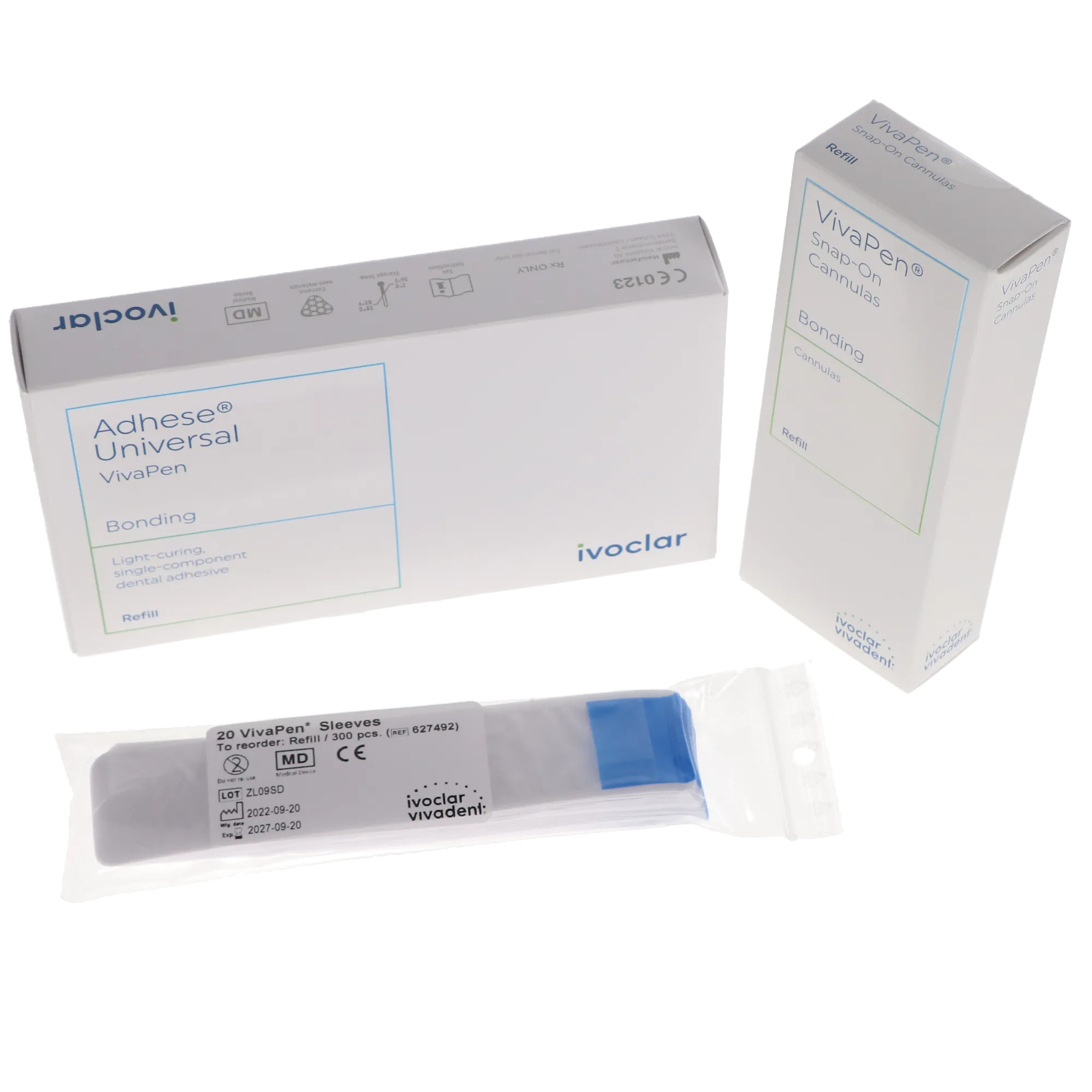 Adhese Universal VivaPen Promo Pack: 1 x 2mL VivaPen, 100 Snap-On Cannulas, 20 Protective Sleeves. Single-component, light cured universal adhesive for direct and indirect bonding procedures.
