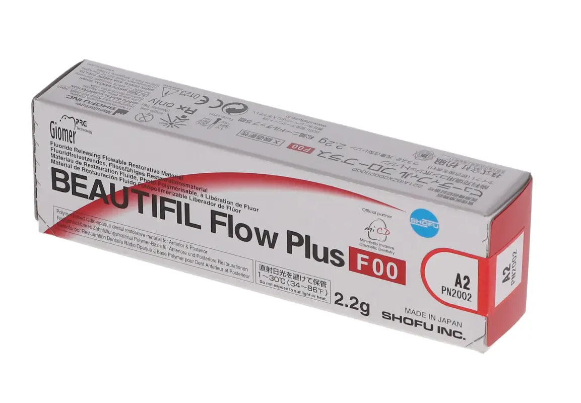 About this product Manufacturer Code: 2002 Brand: Beautifil Flow Plus Class: Flowable composite Curing: Light-cure Packaging: 2.2 gram syringe Shade: A2 Zero Flow Beautifil Flow Plus F00 Zero Flow - A2 Syringe, 1 - 2.2 Gm. Syringe. Injectable Hybrid Restorative Material, Light-Cure. Non-slumping, precision stacking, proximal wall/core build-up material. Non-slumping,...
