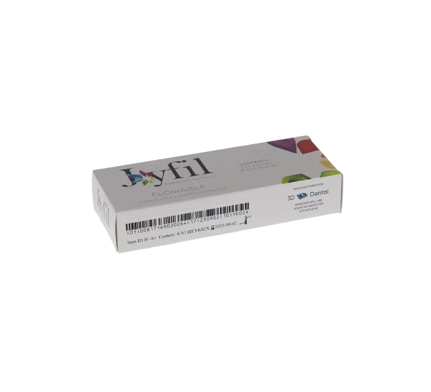 Joy-Fil Flowable Composite is a light-curing, radiopaque restorative with continuous fluoride release, high compressive strength, and low shrinkage. It is indicated for all different types of cavity preparations, such as anterior and posterior applications.