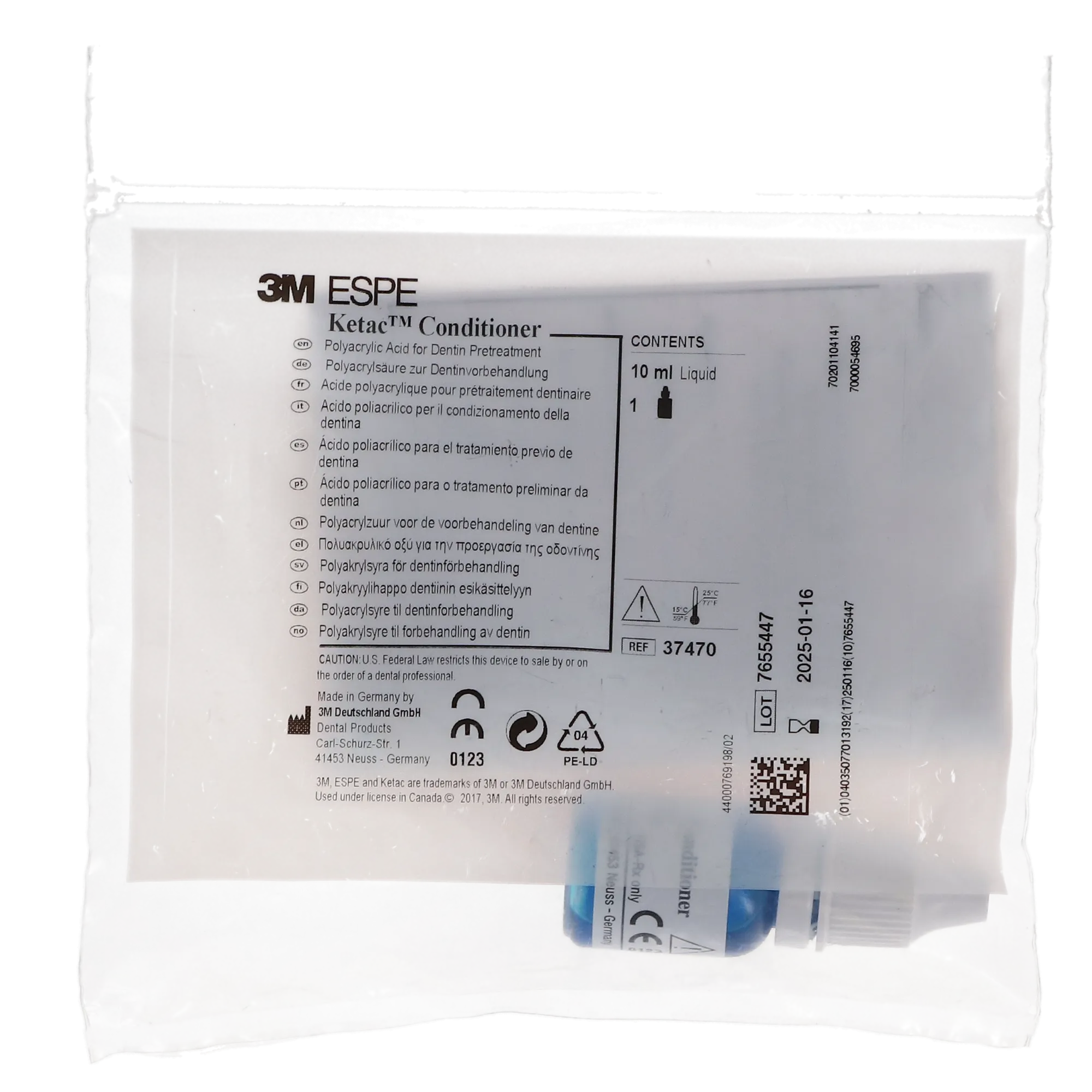 Ketac Conditioner contains polyacrylic acid that removes the smear layer from post tooth preparation. Use Ketac conditioner with dentin conditioning to increase the bond of glass ionomer cement fillings.