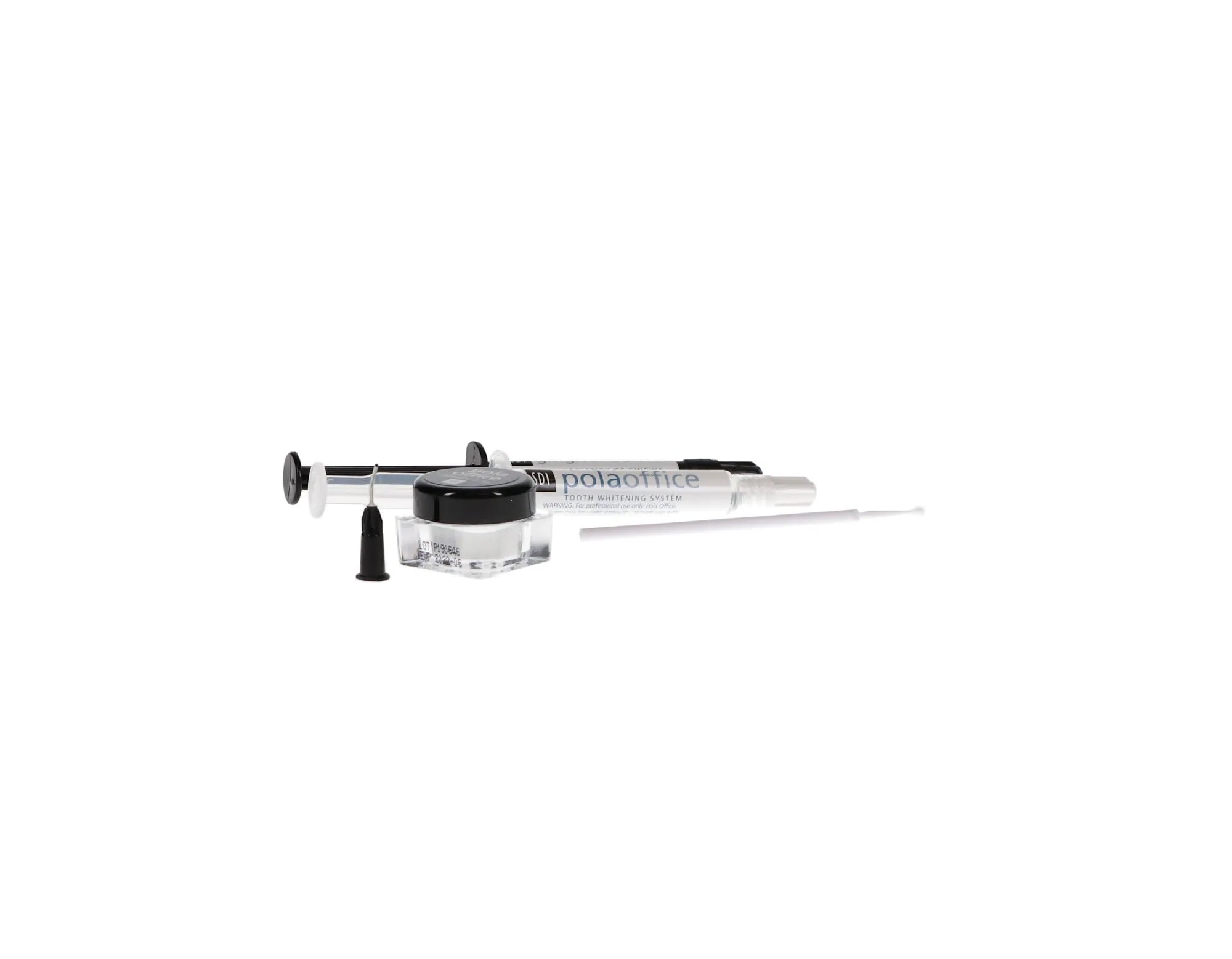 About this product Rapid bleaching action under 30 minutes Requires no bleaching light Designed with built-in desenstizer No-mix formulation for direct application Contains 6 (0.3 g) powder pots, 6 (2 ml) Pola office syringes, 3 (1 g) gingival barrier syringes, and replacement tips. Get faster and more effective results with...