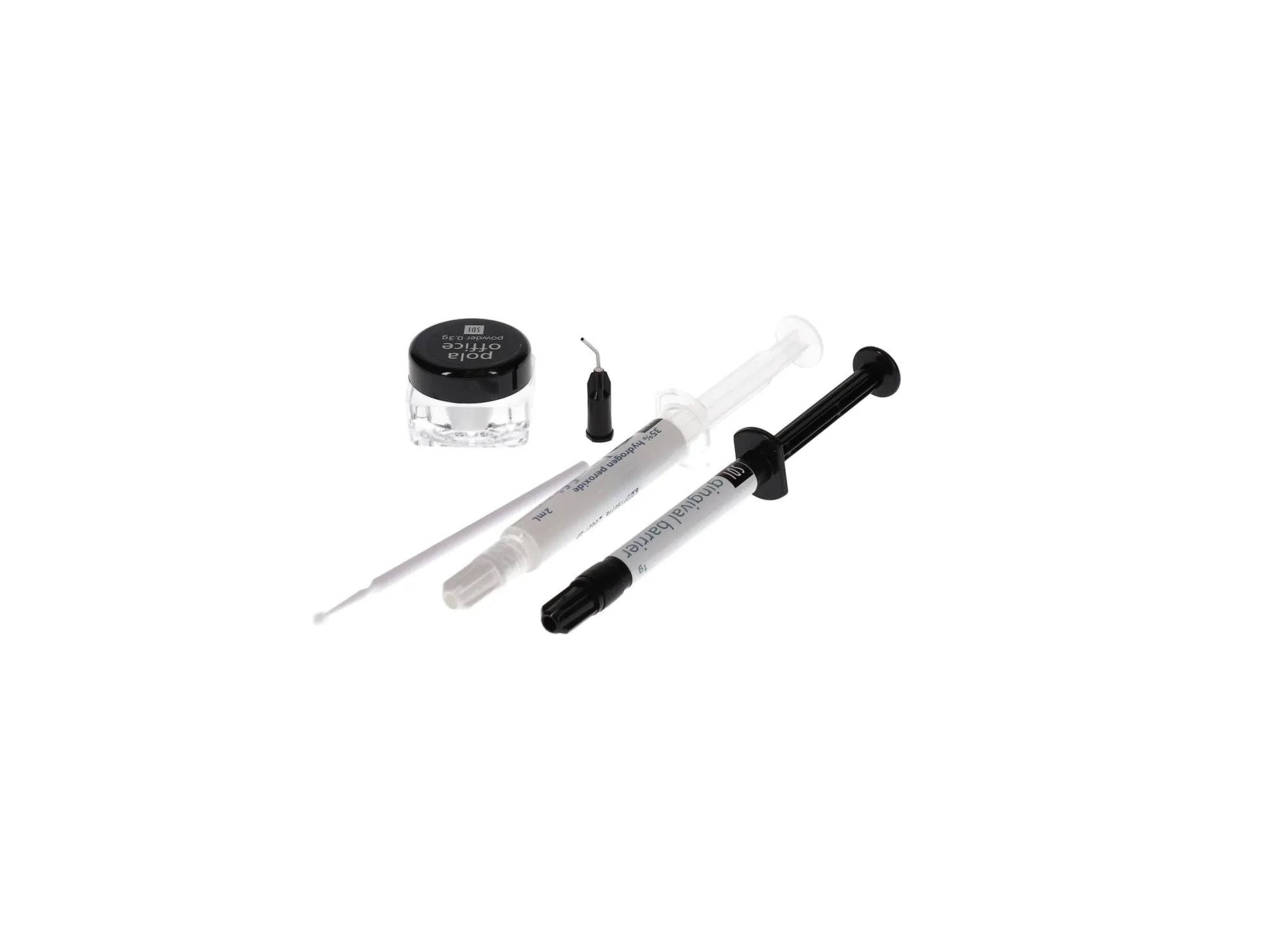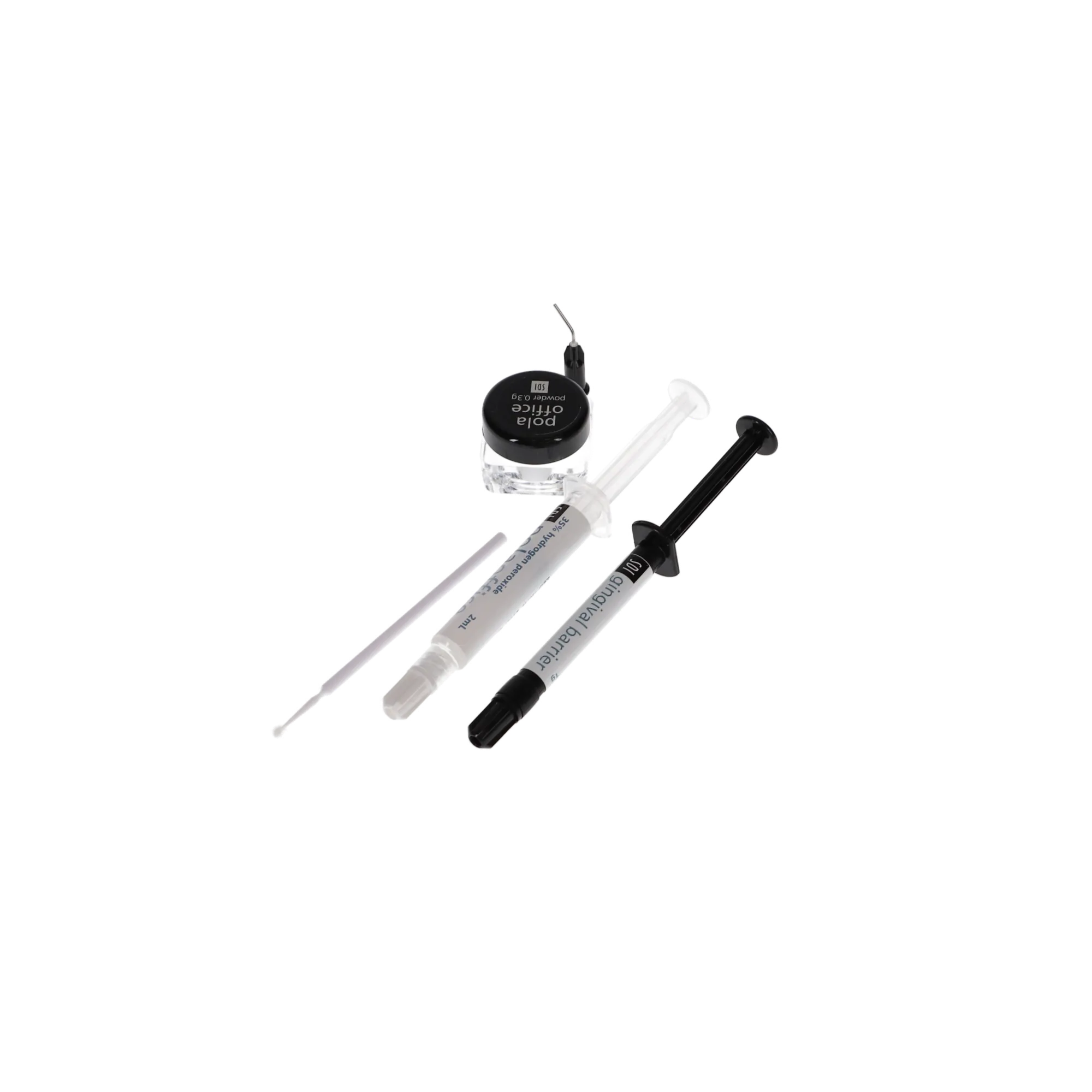 - Contains 6 (0.3 g) powder pots, 6 (2 ml) Pola office syringes, 3 (1 g) gingival barrier syringes, and replacement tips.