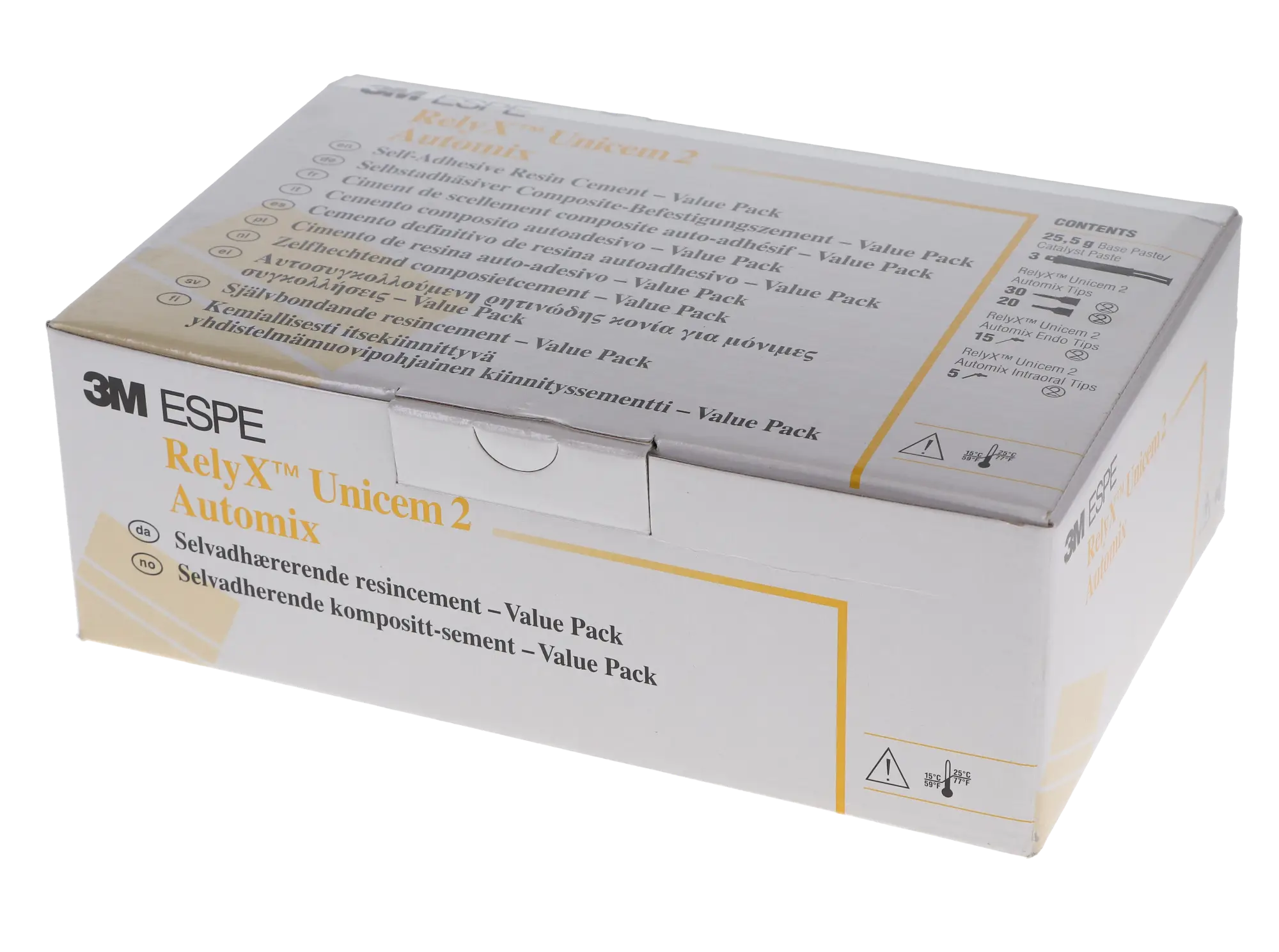 About this product Easy-to-use delivery system With optimal consistency for removal of excess Ensures no post-operative sensitivity Minimizes waste RelyX Unicem 2 Self-Adhesive Resin Cement features a next-generation formula that guarantees an enhanced delivery system. It eliminates the need for etching, priming, and bonding, thereby saving time. RelyX has optimal...