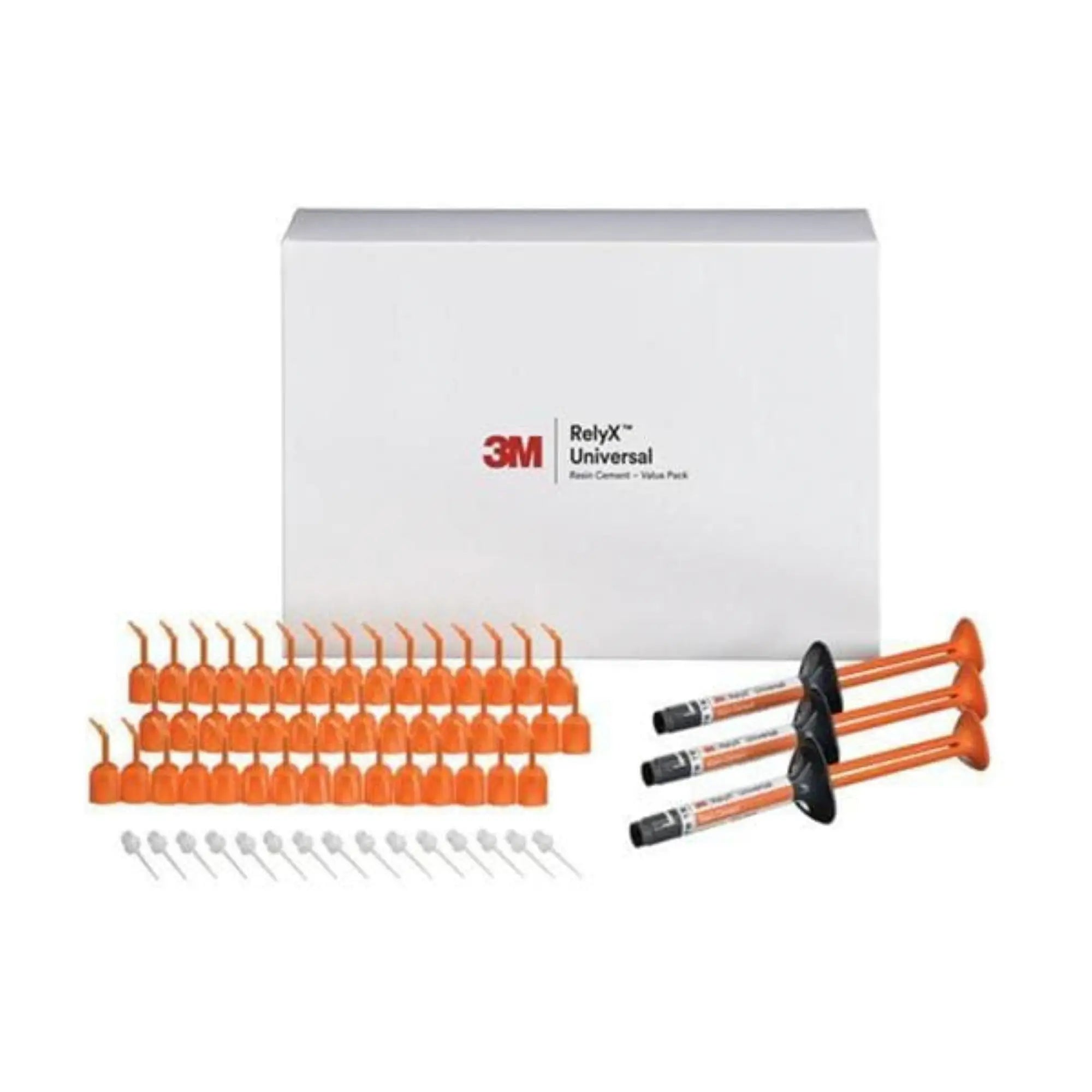 3M RelyX Universal Resin Cement Value Pack – Shade TR. Dual-cure composite cement for all adhesive and self-adhesive indications. Comes in self-sealing syringes for storage without used tips. High esthetics with color-stable, fluorescent shades.