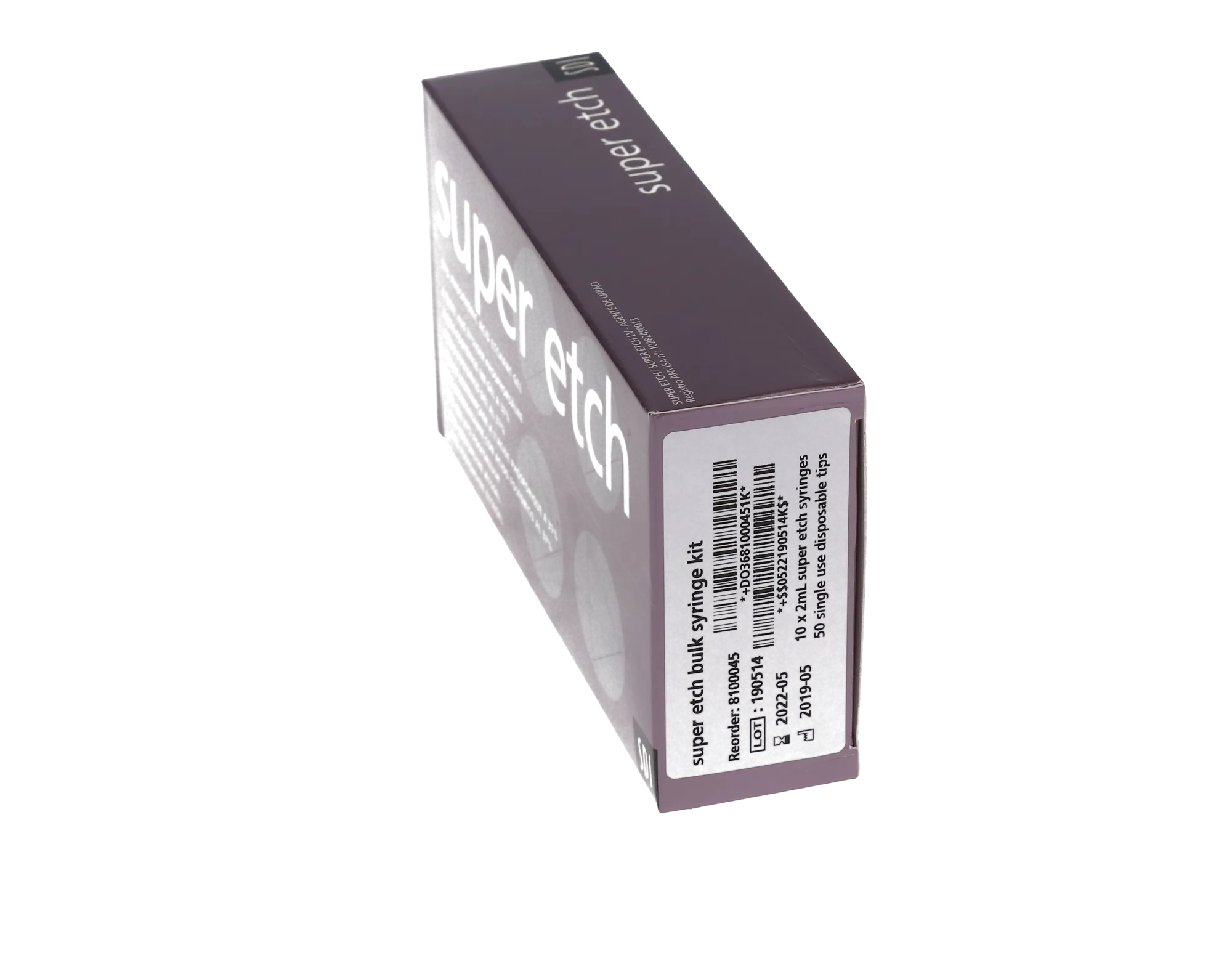 About this product Manufacturer Code: 8100045 Brand: Super Etch Chemical Content: Phosphoric acid Packaging: Bulk kit Strength: 37% Type: Etching Gel Super Etch Syringe Kit. 37% Phosphoric Acid Etch Gel, Bulk Kit: 10 - 2 mL (2.5 gram) Syringes and 50 (23 Ga.) Blue Tips. Super Etch is a low...
