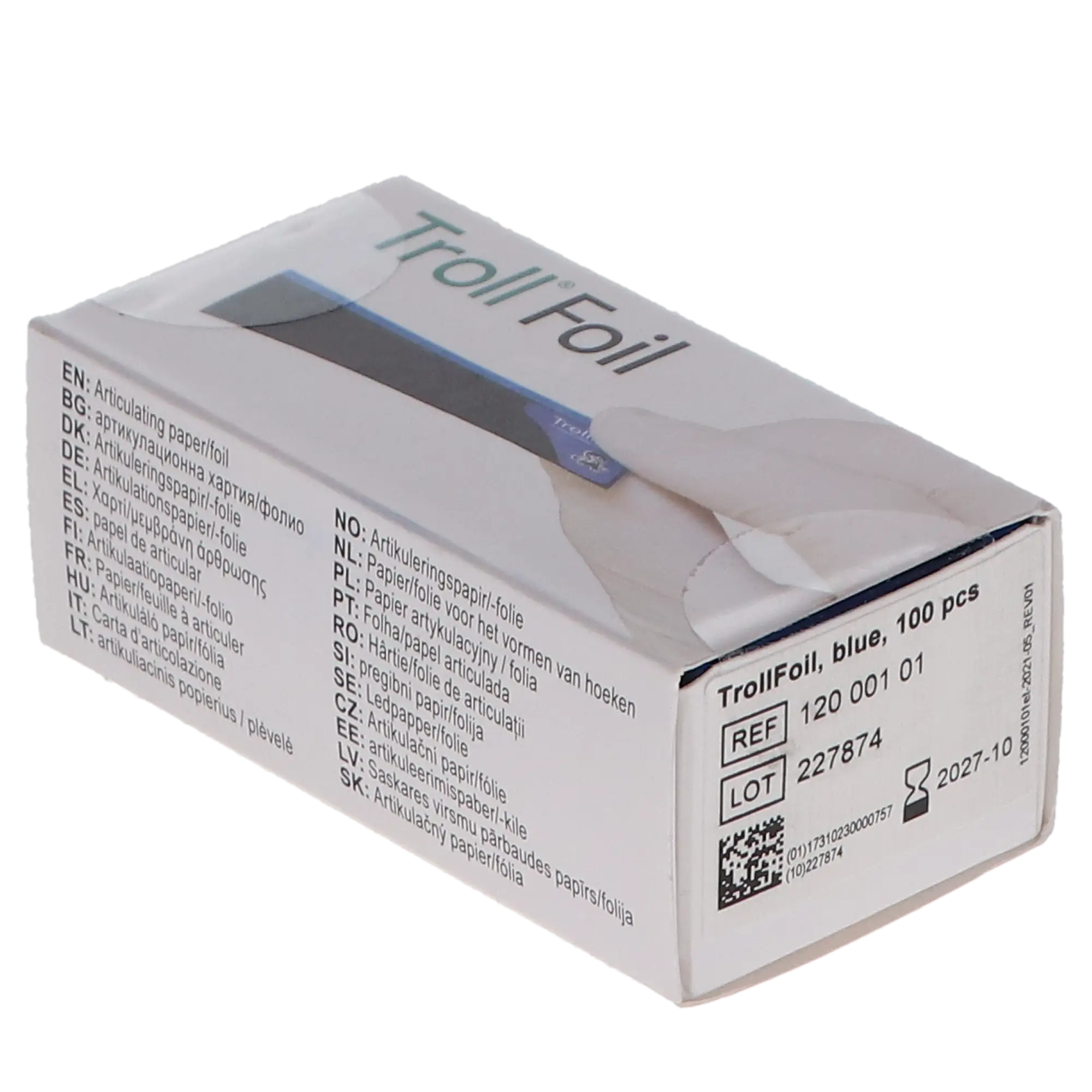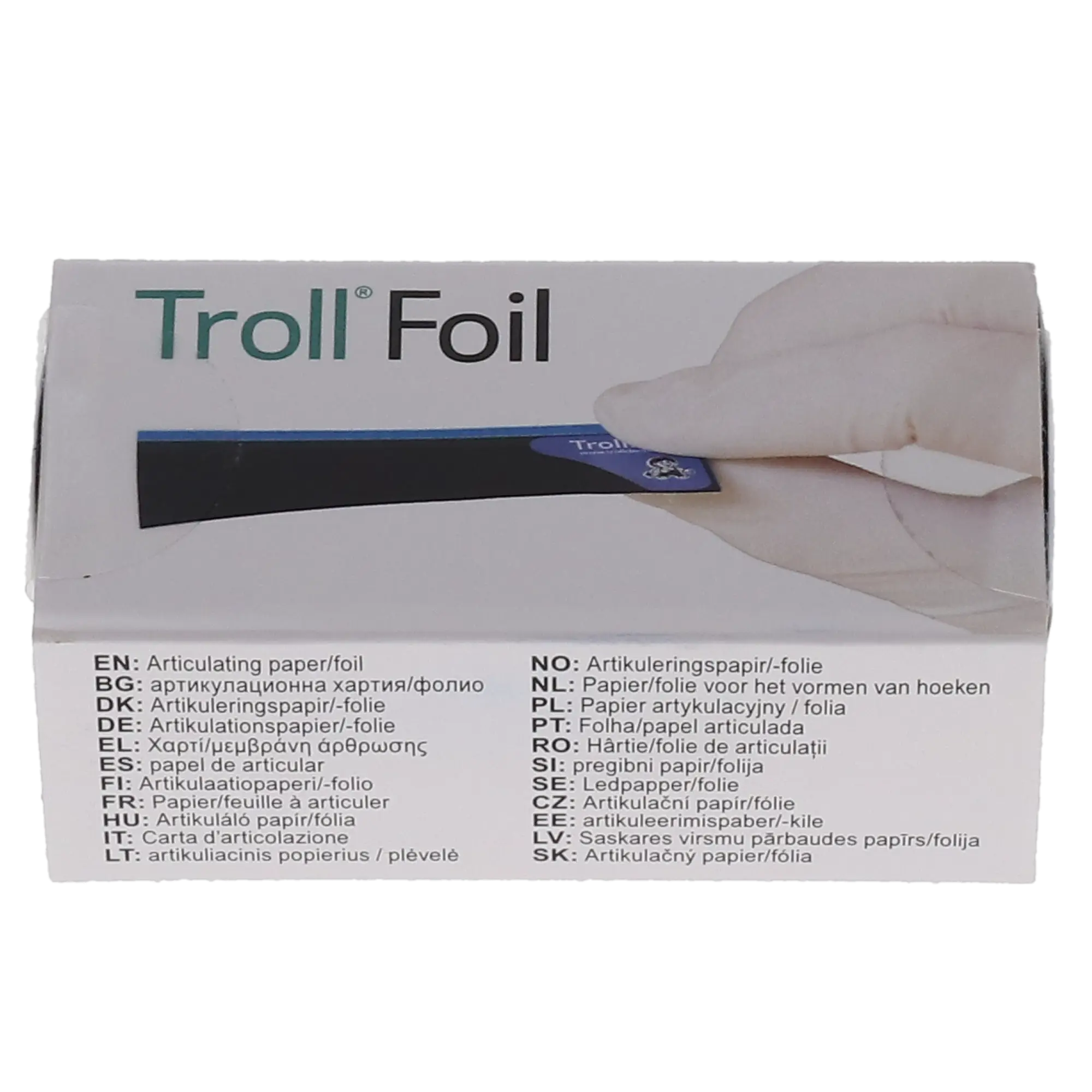 TrollFoil Articulating Foil is a double-sided foil that accurately marks wet or dry surfaces, including teeth, limited opening, limited vestibular space, gaggers, metal, and non-metallic restorations. It measures 8 microns and is made from the thinnest commercial articulating foil to cover half the dental arch from singles to quadrants, allowing occlusal contact verification for two sides.
