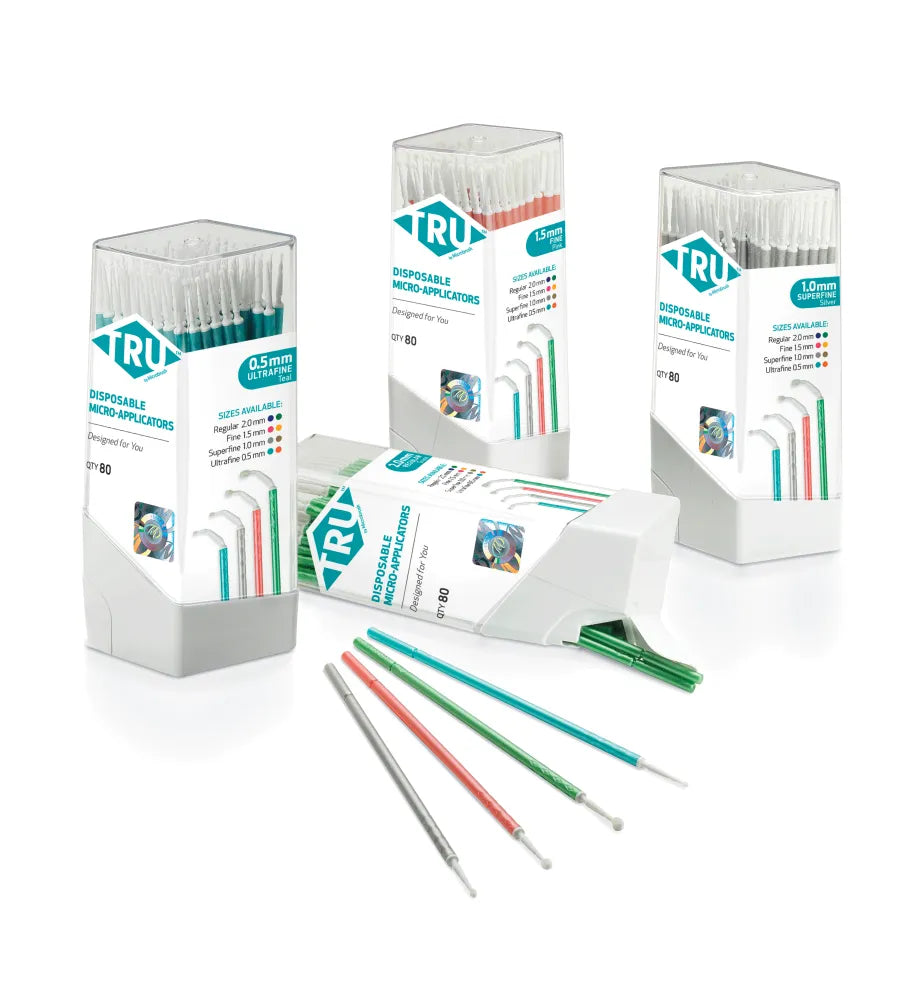 TRU Micro-Applicators feature a dual-bending portion and a fine 1.5 mm head for greater access to hard-to-reach areas.