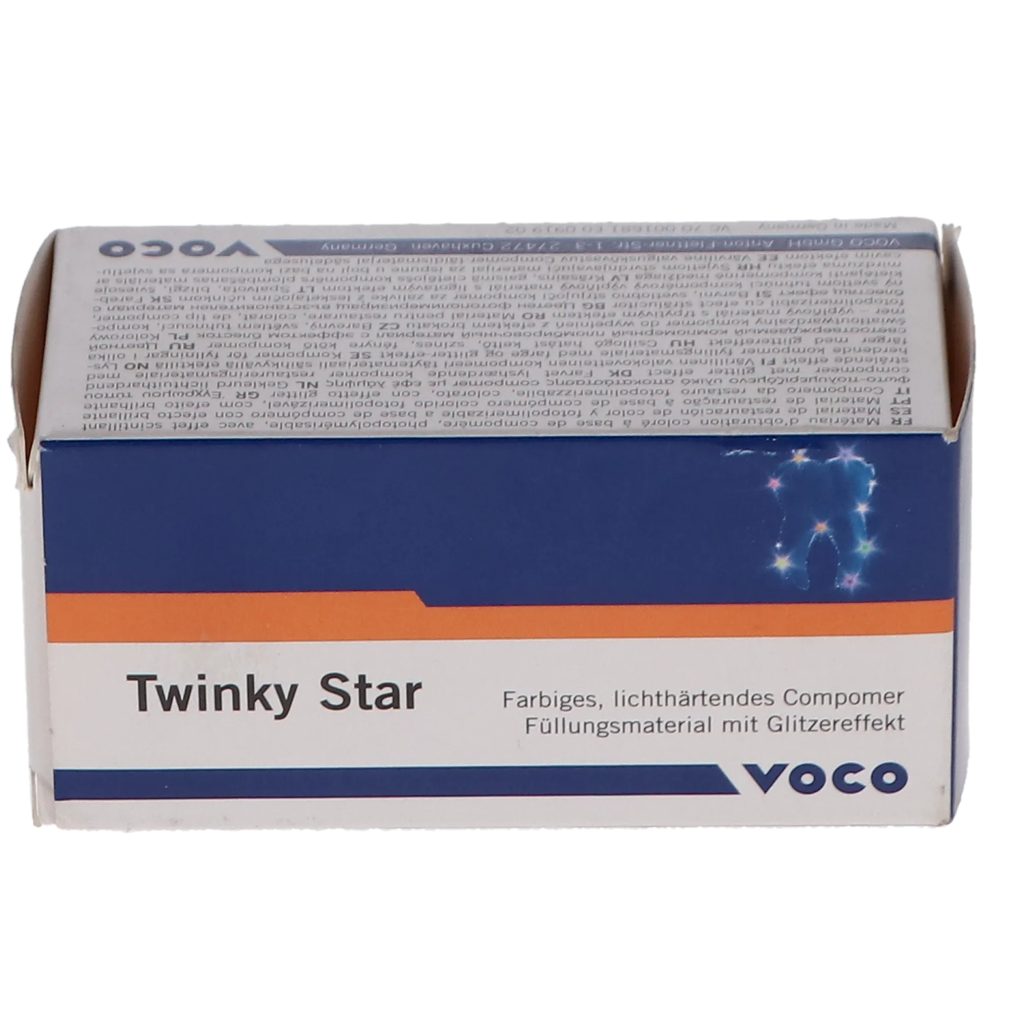 About this product Indicated for deciduous teeth No conditioning required Made for pediatric patients Compatible with Futurabond U for rapid restorations Twinky Star is a colored light-curing, radiopaque compomer restorative material with a glitter effect, specially developed for the treatment of children's deciduous teeth. It features proven VOCO technology that...