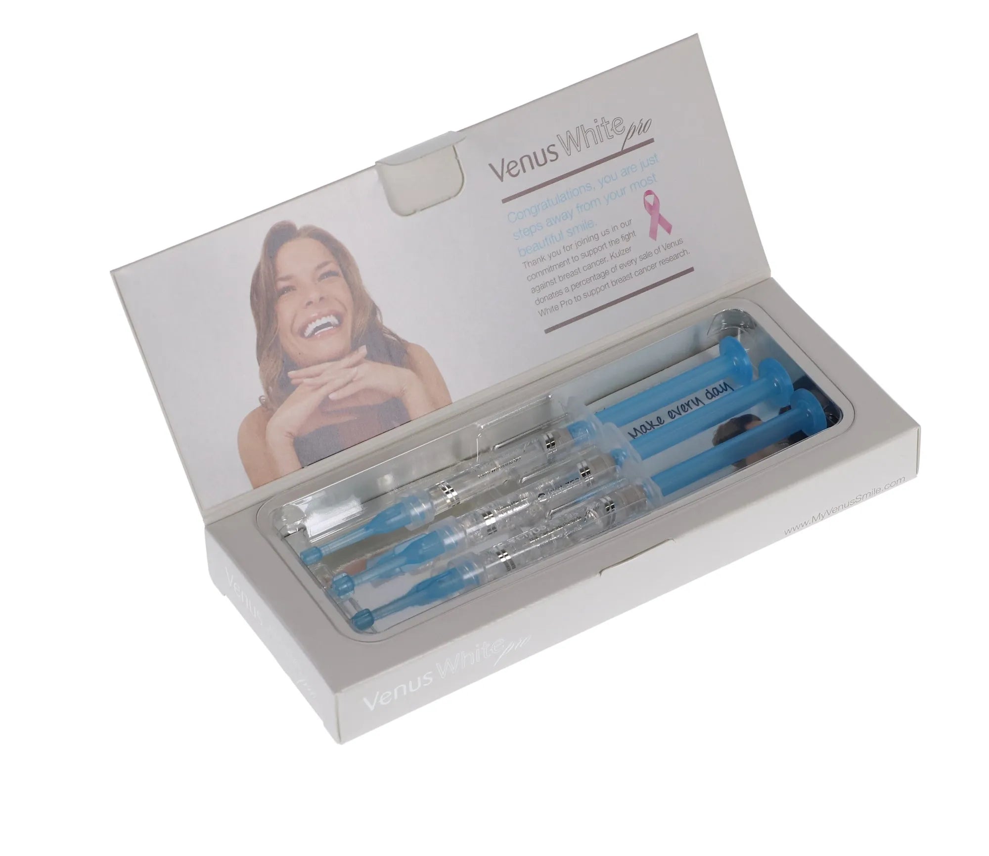 About this product Up to 8 shades whiter teeth Sticky, viscous consistency for convenient application Ensures consistent results Reduces bleaching-related sensitivity The high-performing formulation of Venus White-Pro Whitening combines potassium nitrate and a varying percentage of carbamide peroxide to give up to 8 shades of teeth whitening. Potassium nitrate works...